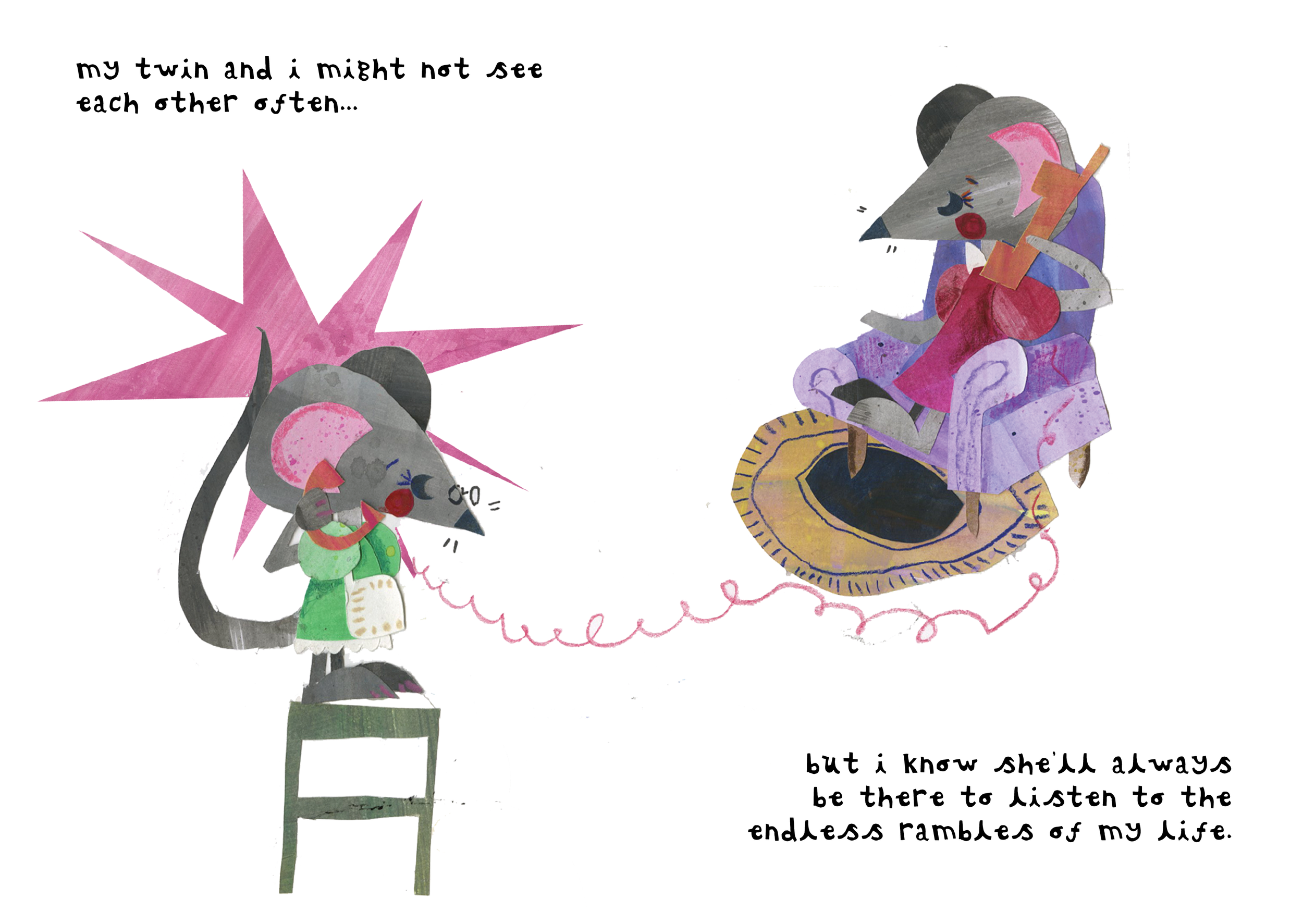 As part of my University studies, I created a Zine inspired by my twin sister, and our relationship - as well as many other sets of twins. I collected responses from other sets of twins to reflect upon, and additionally inspire the work I set out to produce, intuitively generating imagery inspired from their responses - the anthropomorphic animals serving as a tool to encapsulate the theme of diversity amongst sibling relationships and their ups and downs.